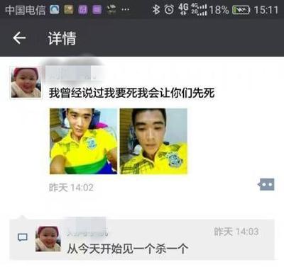 朋友圈圖片顯示:男孩受傷嚴重,眼睛被打腫,大小腿有多處傷痕。圖片轉自另一男子,最讓人覺得不可理喻的是,該男子不僅在朋友圈曬出孩子被打傷的圖片,還配文稱“心里面高興”、“我會繼續(xù)折磨死兩個小孩子”。另外還搭配自拍照稱“我曾經說過我要死我會讓你們先死”并跟帖“從今天開始見一個殺一個”。