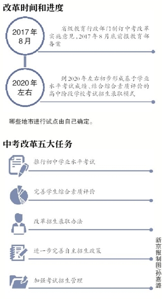 為進(jìn)一步推進(jìn)高中階段學(xué)校考試招生制度改革,《意見》提出五大任務(wù),包括推行初中學(xué)業(yè)水平考試、完善學(xué)生綜合素質(zhì)評(píng)價(jià)、改革招生錄取辦法、進(jìn)一步完善自主招生政策和加強(qiáng)考試招生管理。