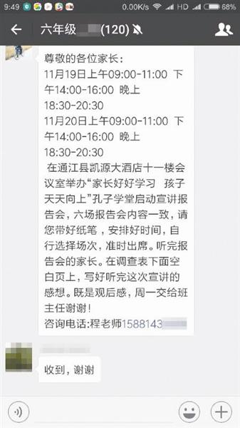記者聯(lián)系上負(fù)責(zé)講座咨詢的程老師,他表示,此次活動(dòng)并沒有和通江縣教育科技體育局聯(lián)系,在和通江縣實(shí)驗(yàn)小學(xué)對(duì)接時(shí),確實(shí)講過要向?qū)W校捐贈(zèng)孔子文化教室,但目前還未定。在酒店舉行講座的事情沒有向通江縣實(shí)驗(yàn)小學(xué)提過。他們?cè)趯W(xué)校門口組織志愿者發(fā)調(diào)查表,在通江的其他學(xué)校門口也發(fā)了調(diào)查表。對(duì)于老師在群里向家長(zhǎng)發(fā)講座信息,程老師表示是個(gè)人行為,義務(wù)幫忙。程認(rèn)為,講座不收錢就是公益講座,推銷產(chǎn)品家長(zhǎng)購(gòu)買是家長(zhǎng)的自愿行為。