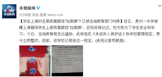 近日,貴州一中學(xué)被曝上課期間學(xué)生上廁所需脖掛“如廁牌”,否則將被記過。校方稱為了學(xué)生安全和學(xué)習(xí)。今日,當(dāng)?shù)亟逃职l(fā)出通知,此舉違反《未成年人保護(hù)法》和學(xué)校管理規(guī)定,責(zé)令立即整改。目前,該學(xué)校已取消這一規(guī)定。