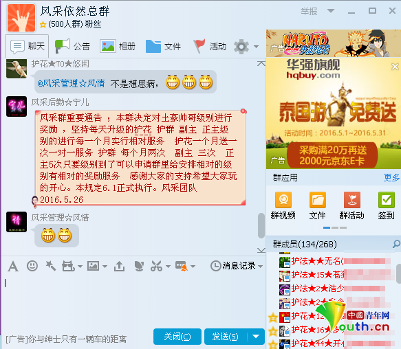 在“風(fēng)采依然總?cè)骸眱?nèi),中國(guó)青年網(wǎng)記者看到,成員共有268人。男性群成員被稱為“土豪帥哥”,按照貢獻(xiàn)大小分為情郎、護(hù)法、護(hù)花、護(hù)群、名譽(yù)副主、名譽(yù)正主、風(fēng)采親王7個(gè)等級(jí)。群主制定了一套升級(jí)規(guī)則,方式是在群內(nèi)發(fā)紅包,男性群成員只能搶自己發(fā)的紅包,搶錯(cuò)了必須發(fā)出來(lái),否則會(huì)被移出群。女性群成員提供色情聊天服務(wù),可以搶所有的紅包。