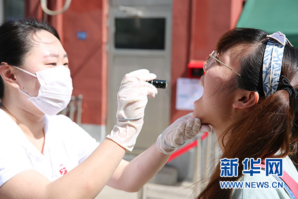 幼兒園保健醫(yī)生對(duì)“孩子”做進(jìn)一步晨檢。