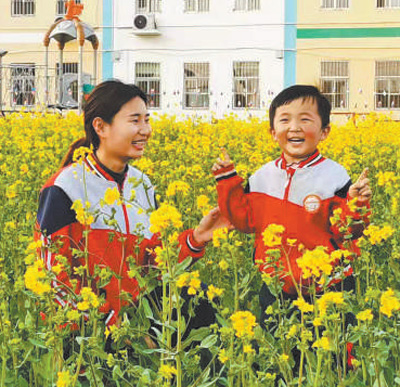 河北省大名縣黃金堤鄉(xiāng)金鄉(xiāng)水岸幼兒園老師給孩子講解油菜花。人民日報記者 張騰揚(yáng)攝
