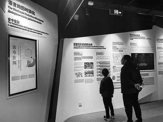 北京外國語大學(xué)世界語言博物館,一對父子正在參觀。
