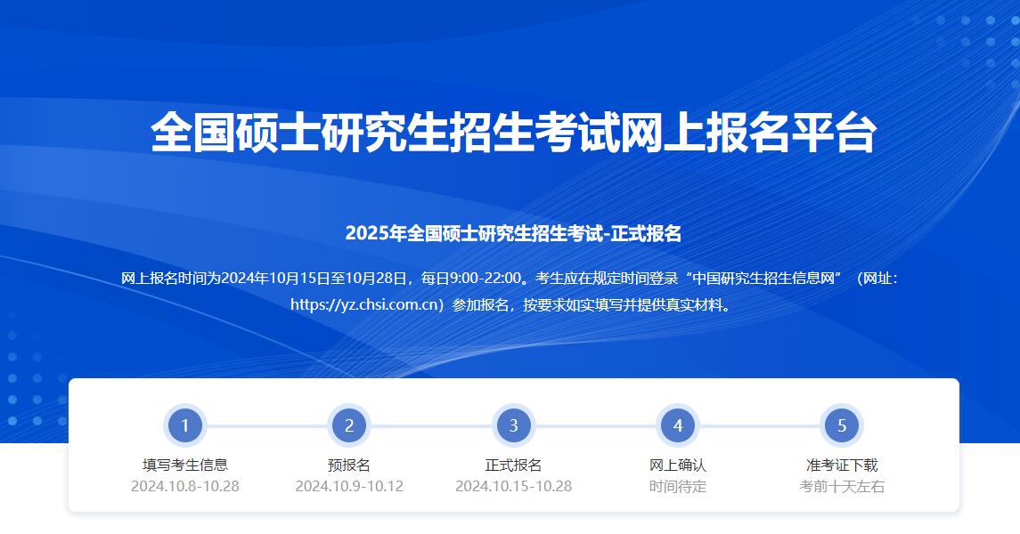網(wǎng)上報名時間為2024年10月15日至10月28日(網(wǎng)上預(yù)報名時間為2024年10月9日至10月12日,相關(guān)工作安排由各省級教育招生考試機(jī)構(gòu)確定并公布),每日9:00-22:00??忌鷳?yīng)在規(guī)定時間登錄“中國研究生招生信息網(wǎng)”(網(wǎng)址:https://yz.chsi.com.cn)參加報名,按要求如實填寫并提供真實材料。