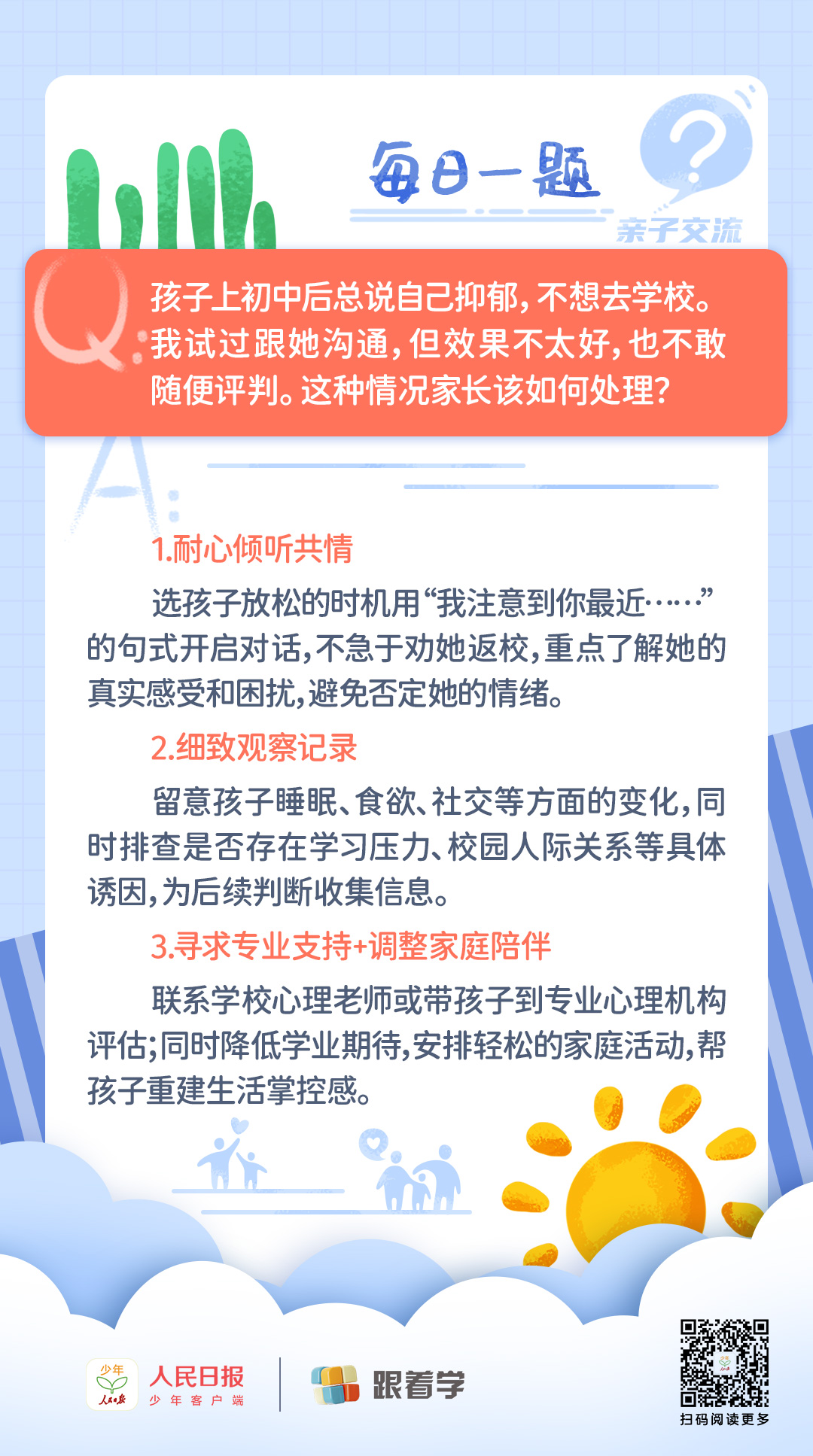 | 每日一題丨初中生自稱抑郁不愿意上學(xué),家長(zhǎng)該如何處理? |