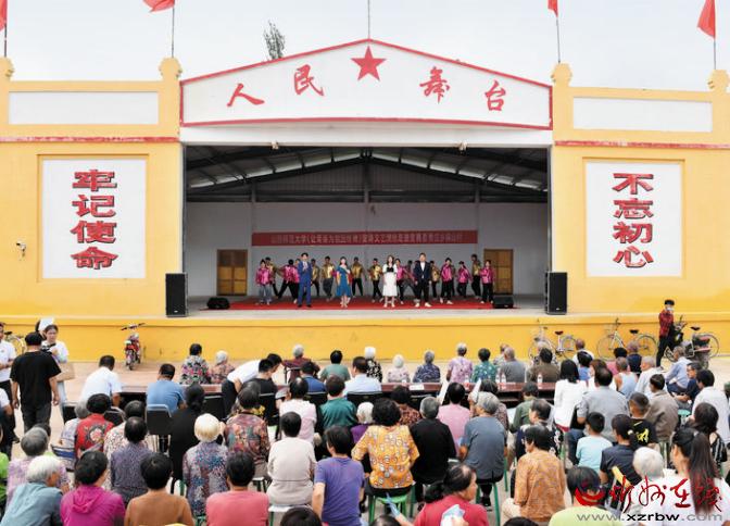 一大早,86歲的郗嬋根老人攙著89歲的老伴李尚文就帶著小馬扎來到文化廣場。前一天,老人就聽說村里要來個大學生文藝表演隊,說是宣講習近平總書記視察山西重要講話重要指示。她心想,折子戲、樣板戲常聽常看,這大學生的文藝表演咱可是第一次看。