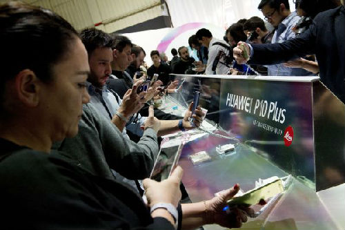 2月26日,在西班牙巴塞羅那舉行的世界移動(dòng)通信大會(huì)開幕前,人們?cè)囉弥袊?guó)品牌華為新發(fā)布的P10和P10 Plus手機(jī)。(新華社)