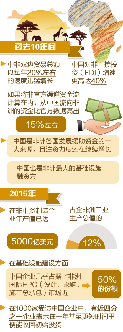 從經(jīng)營(yíng)領(lǐng)域上看,調(diào)查顯示,中國(guó)企業(yè)在非洲的經(jīng)營(yíng)領(lǐng)域十分廣泛,除制造業(yè)外,服務(wù)業(yè)企業(yè)占比達(dá)四分之一,貿(mào)易企業(yè)與建筑及房地產(chǎn)企業(yè)占比各為五分之一。2015年,在非中資制造企業(yè)年產(chǎn)值已達(dá)5000億美元,占全非洲工業(yè)生產(chǎn)總值的12%。在基礎(chǔ)設(shè)施建設(shè)方面,中國(guó)企業(yè)的主導(dǎo)地位更為明顯——幾乎占據(jù)了非洲國(guó)際EPC(設(shè)計(jì)、采購(gòu)、施工總承包)市場(chǎng)近50%的份額。中國(guó)企業(yè)的盈利也相當(dāng)可觀,在1000家受訪企業(yè)中,有近四分之一企業(yè)表示在一年甚至更短時(shí)間里便能收回初始投資,三分之一的企業(yè)利潤(rùn)率超過(guò)20%。而且,這些企業(yè)的市場(chǎng)觸覺(jué)極其敏銳,能夠迅速適應(yīng)新環(huán)境、響應(yīng)新機(jī)遇。這些企業(yè)主要側(cè)重滿足非洲日益增長(zhǎng)的市場(chǎng)需求,而非出口業(yè)務(wù)。許多中國(guó)企業(yè)已在非洲開展了長(zhǎng)期投資,有74%的受訪中資企業(yè)對(duì)未來(lái)發(fā)展前景抱有樂(lè)觀態(tài)度。