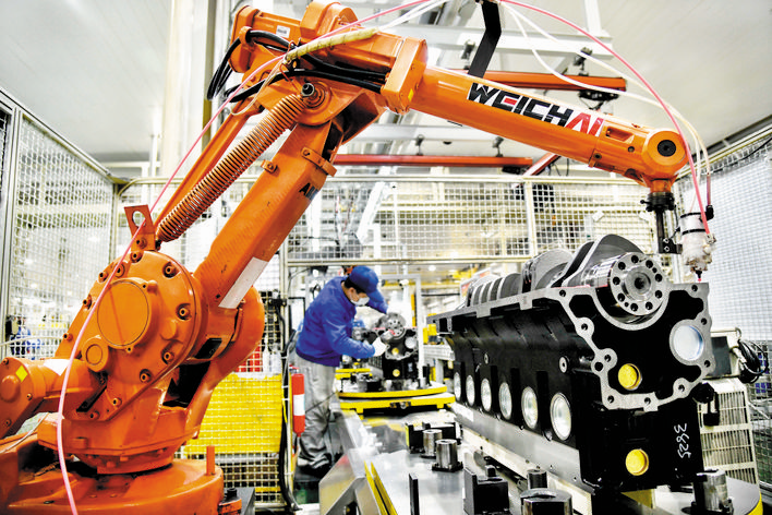 在位于山東濰坊的濰柴集團(tuán)一號工廠總裝車間,工人們在流水線上裝配發(fā)動機(jī)(3月19日攝)。 3月31日,國家統(tǒng)計局服務(wù)業(yè)調(diào)查中心、中國物流與采購聯(lián)合會發(fā)布數(shù)據(jù),3月份,中國制造業(yè)采購經(jīng)理指數(shù)(PMI)為52%,比上月回升16.3個百分點。