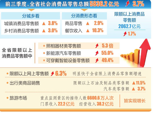 前三季度,全省消費(fèi)呈現(xiàn)哪些特點(diǎn)。據(jù)省統(tǒng)計局相關(guān)負(fù)責(zé)人介紹,新型消費(fèi)快速增長,全省限額以上消費(fèi)品零售額中,照相器材類零售額增長5.3倍,新能源汽車零售額增長55.0%,可穿戴智能設(shè)備零售額增長49.4%。限額以上網(wǎng)上零售額增長6.3%,明顯快于全省限上消費(fèi)品零售額增速;出行類商品銷售帶動明顯,全省限額以上石油及制品類零售額增長11.5%,汽車類零售額增長3.7%;旅游市場持續(xù)回暖,全省重點(diǎn)監(jiān)測景區(qū)接待人數(shù)6600.6萬人次,門票收入22.2億元,經(jīng)營收入38.2億元,皆實(shí)現(xiàn)增長。