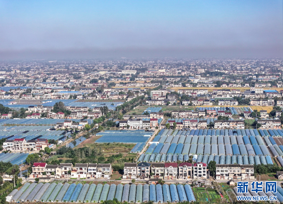 深秋時節(jié),從空中俯瞰江蘇省靖江市馬橋鎮(zhèn)橫港村,整片的蔬菜大棚、錯落有致的民居,田園風光美如畫卷。