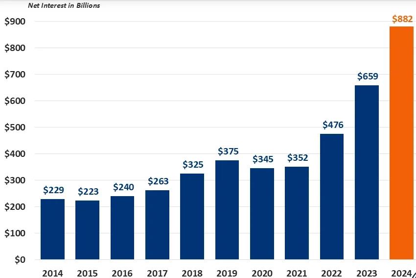 根據(jù)美國(guó)財(cái)政部11月20日公布的數(shù)據(jù),2024年美國(guó)聯(lián)邦政府僅用以?xún)斶€美債利息的支出就達(dá)到了8820億美元。相較2023年6590億美元的利息支出,2024年美債利息支出增長(zhǎng)率達(dá)33.8%。
