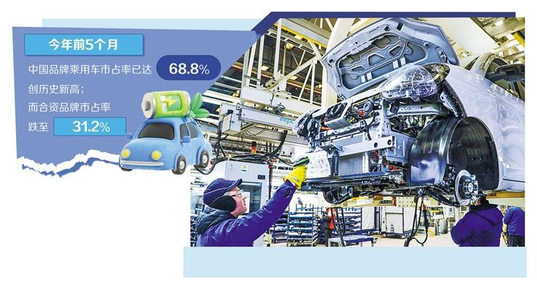 電動化與智能化變革浪潮,不僅在加速汽車產(chǎn)品進化,也在深刻重構(gòu)市場競爭格局。中汽協(xié)數(shù)據(jù)顯示,今年前5個月,中國品牌乘用車市占率已達68.8%,創(chuàng)歷史新高;而合資品牌市占率跌至31.2%,創(chuàng)出新低。