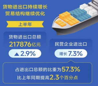 貨物進(jìn)出口持續(xù)增長,貿(mào)易結(jié)構(gòu)繼續(xù)優(yōu)化。上半年,貨物進(jìn)出口總額217876億元,同比增長2.9%。民營企業(yè)進(jìn)出口增長7.3%,占進(jìn)出口總額的比重為57.3%,比上年同期提高2.3個百分點(diǎn)。