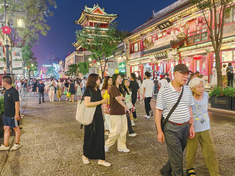 8月2日,入夜后的太原市鐘樓街燈火璀璨、熱鬧非凡,市民們來此散步休閑、購物娛樂,體驗多元消費(fèi)業(yè)態(tài)。
