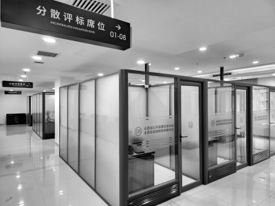 參觀完一層大廳后,工作人員將媒體觀摩團帶到了四層一個全封閉的區(qū)域——評標區(qū),隨機抽取的專家會在這里進行評標工作。代表們首先是被一系列的科技防范“硬措施”所震撼,人臉識別身份核驗機、金屬探測門防范冒名頂替,通信設備存儲柜、文件傳送智能機器人阻斷不必要的溝通,軌跡定位卡、電子呼叫系統(tǒng)、電子門牌等技術的應用實現(xiàn)了對交易人員身份類別權(quán)限的精準管控……還有全方位、超高清、永久保存的監(jiān)控設備,實時對外直播的電子大屏,實現(xiàn)了嚴密管控、處處震懾。