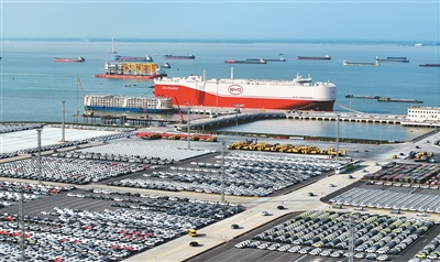 4月27日,搭載7000余輛比亞迪新能源商品車的汽車運(yùn)輸船比亞迪“深圳”號(hào)首航駛往巴西,創(chuàng)下國(guó)內(nèi)汽車單次出口量一個(gè)批次最多的紀(jì)錄。圖為運(yùn)輸船正在江蘇省蘇州港太倉港區(qū)裝載汽車。計(jì)海新攝(人民視覺)