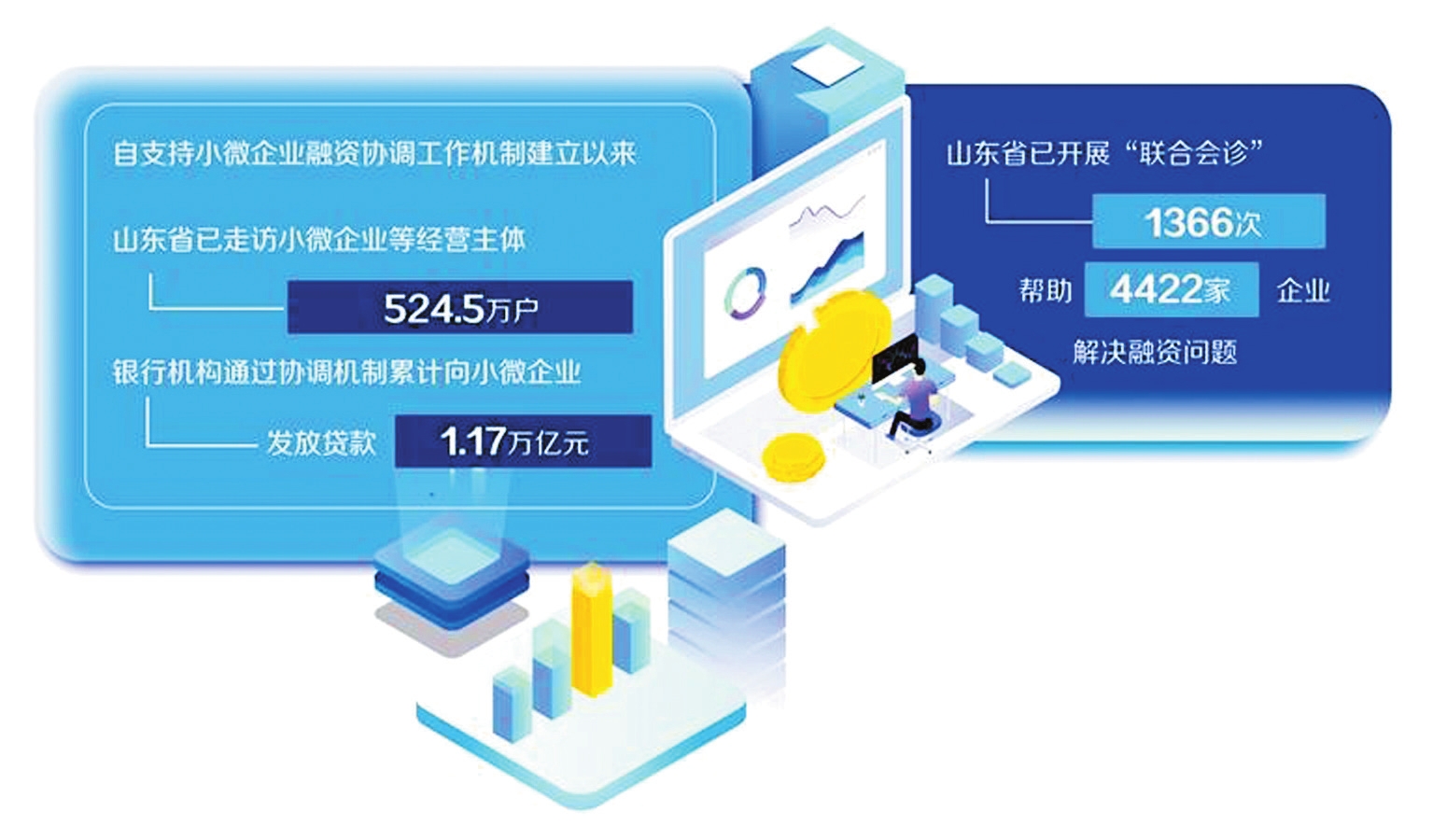 自小微協(xié)調(diào)機制建立以來,山東做精做深融資對接,著力推動形成破解融資難的有效措施和長效機制。從全省小微企業(yè)融資情況看,截至目前,山東省已走訪小微企業(yè)等經(jīng)營主體524.5萬戶;銀行機構(gòu)通過協(xié)調(diào)機制累計向小微企業(yè)發(fā)放貸款1.17萬億元。