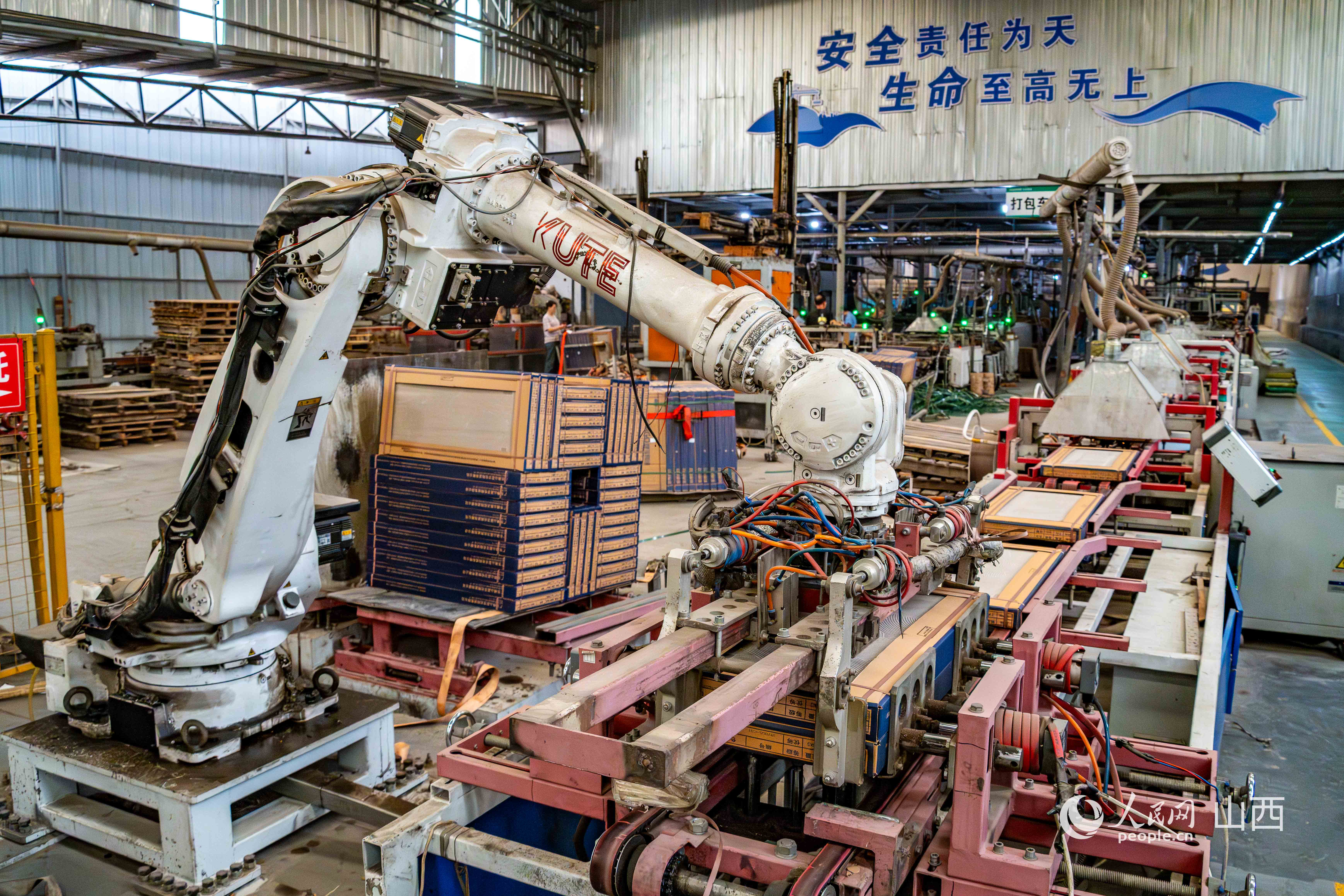華冠陶瓷有限公司的生產(chǎn)車間,機械臂正在打包裝箱。人民網(wǎng) 馬夢迪攝
