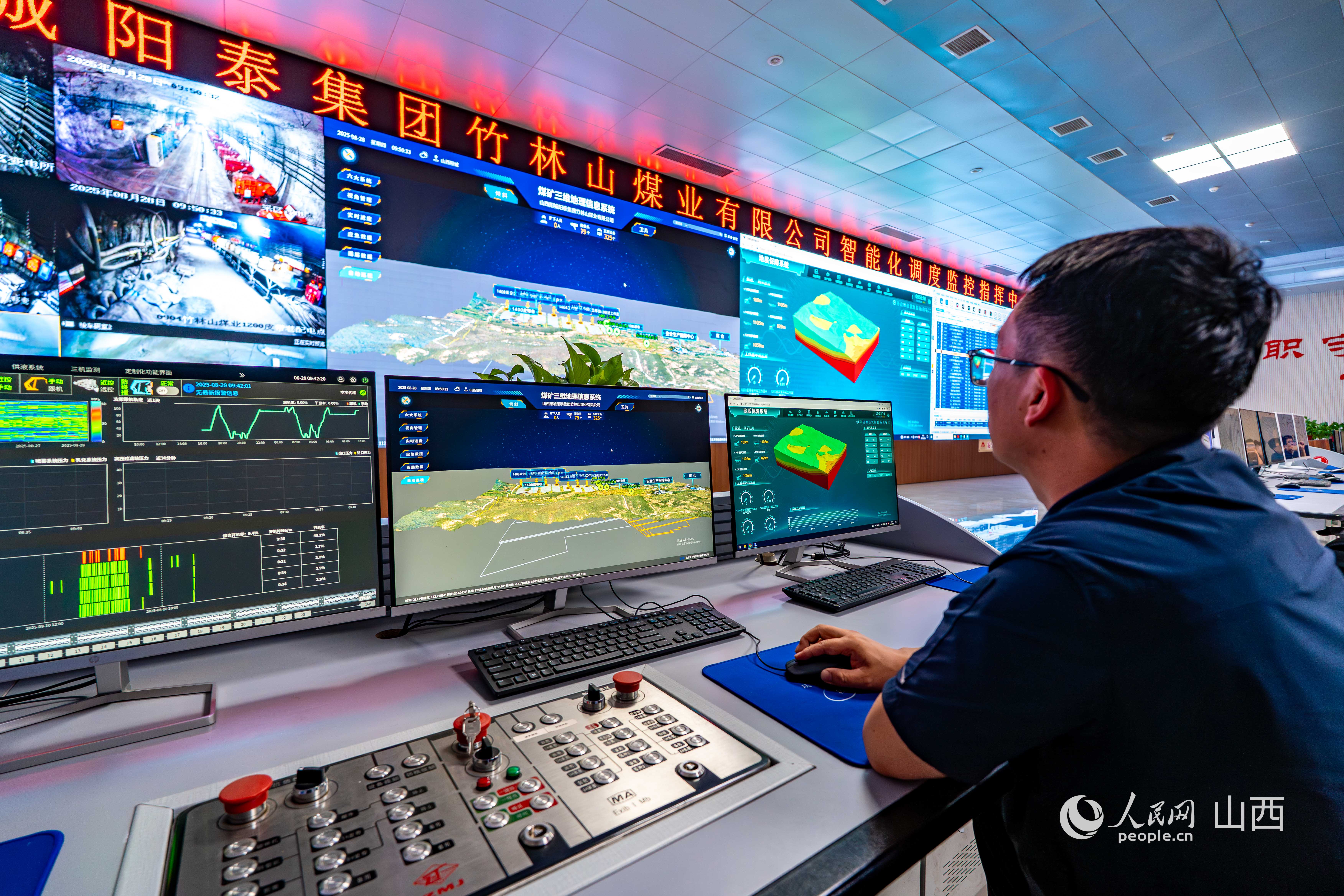 陽泰集團竹林山煤業(yè)有限公司智能化調(diào)度監(jiān)控指揮中心。人民網(wǎng) 馬夢迪攝