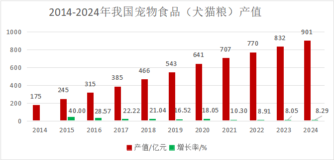 中國農(nóng)業(yè)科學院飼料研究所寵物營養(yǎng)團隊數(shù)據(jù)統(tǒng)計顯示,2024年我國寵物犬貓飼養(yǎng)量達1.4億只,寵物產(chǎn)業(yè)總規(guī)模突破3000億元,其中寵物食品市場占比最高。到2024年,寵物食品犬貓糧市場規(guī)模達到900億元,比2023年增長8.3%。