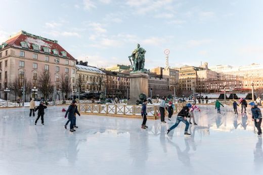 2015年2月6日,人們在瑞典斯德哥爾摩市中心的國王花園溜冰。斯德哥爾摩的冬季常年被白雪覆蓋,陽光下的城市顯得格外寧靜。