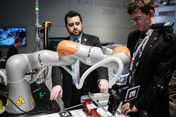 資料圖片:2016年4月27日,在德國(guó)漢諾威工業(yè)博覽會(huì)上,工作人員在德國(guó)庫(kù)卡機(jī)器人公司展區(qū)展示機(jī)器人手臂。新華社記者張帆攝