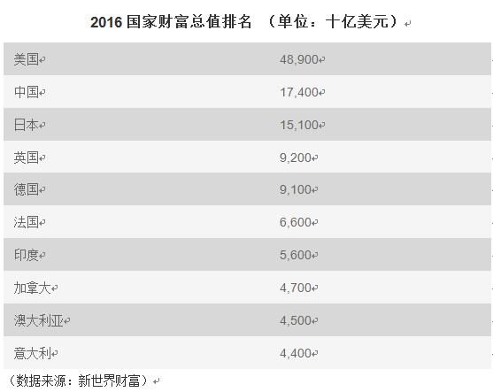 | 2016全球十大最富國(guó)家出爐:美國(guó)居首 中國(guó)第二 |