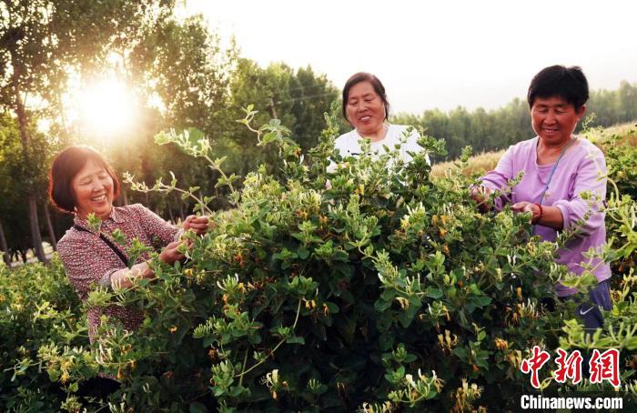夕陽下,山西省運(yùn)城市新絳縣澤掌鎮(zhèn)喬溝頭村,花農(nóng)趙藕平(左)和鄰里采摘豐收的金銀花。高新生 攝