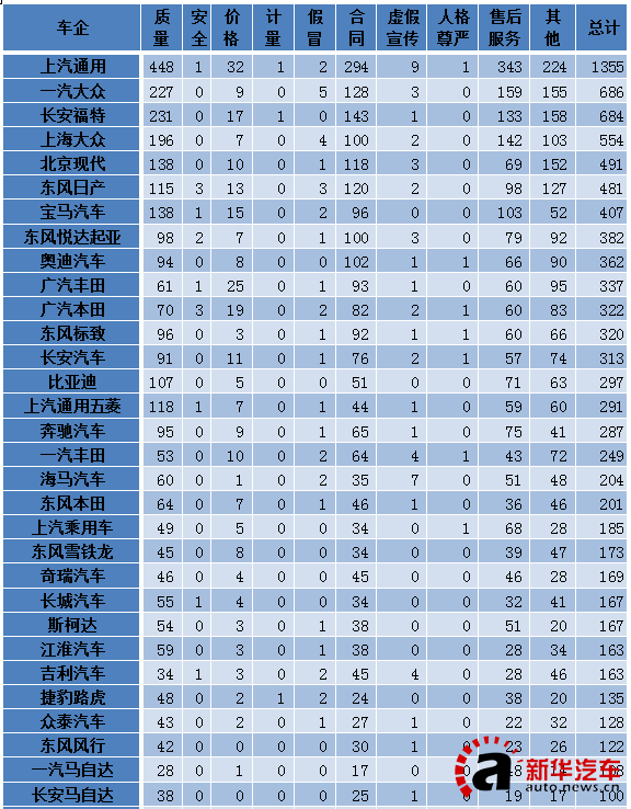 中消協2015汽車廠家被投訴具體數據排行榜(部分)
