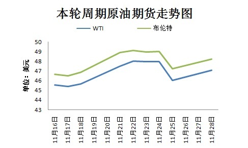 本輪計(jì)價(jià)周期內(nèi),國(guó)際原油價(jià)格呈現(xiàn)先漲后跌再漲態(tài)勢(shì)。截至11月28日收盤(pán),當(dāng)日,美國(guó)WTI原油期貨漲1.02美元,報(bào)收47.08美元/桶;布倫特原油期貨漲1.00美元,報(bào)收48.24美元/桶。