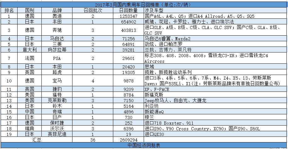 根據(jù)國(guó)家質(zhì)檢總局缺陷產(chǎn)品管理中心3月份發(fā)布的召回公告,中國(guó)經(jīng)濟(jì)網(wǎng)汽車頻道經(jīng)過匯總、統(tǒng)計(jì),整理出“3月國(guó)內(nèi)乘用車召回榜單”。3月份,中國(guó)汽車市場(chǎng)內(nèi)共有21個(gè)汽車品牌發(fā)布了累計(jì)36次召回公告,共計(jì)召回2609294輛汽車。