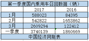 2016年,國(guó)內(nèi)乘用車召回?cái)?shù)量首次突破一千萬輛,達(dá)到11331565輛。進(jìn)入2017年,國(guó)內(nèi)乘用車召回?cái)?shù)量繼續(xù)井噴,今年一季度累計(jì)召回汽車3740139輛,同比2016年一季度的1860669輛增長(zhǎng)了101.01%。
