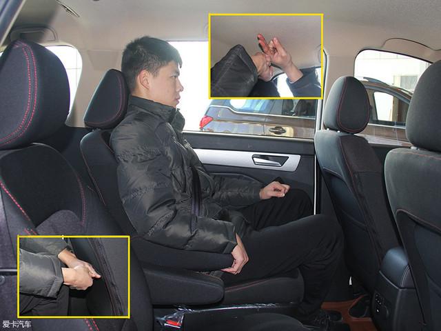保持第二排座椅位置不變,同一位模特坐進(jìn)第三排,頭部有四指余量,腿部空間則稍顯局促。
