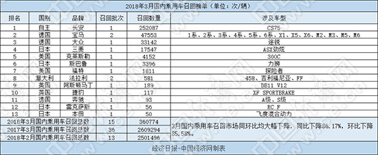 根據國家質檢總局缺陷產品管理中心3月份發(fā)布的召回公告,經濟日報-中國經濟網汽車頻道經過匯總、統計,整理出“2018年3月國內乘用車召回榜單”。3月,國內乘用車市場共有13個品牌發(fā)布15次召回公告,累計召回汽車360774輛,召回數量同環(huán)比均出現大幅下降,其中同比下降86.17%,環(huán)比下降85.58%。