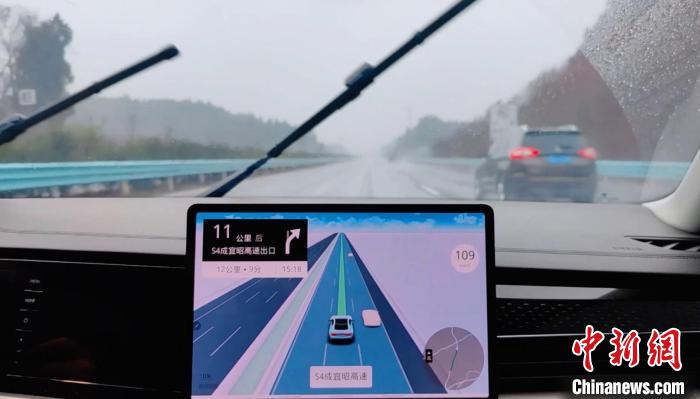 圖為國內(nèi)首個“智慧高速+車機導航”應(yīng)用在下雨的成宜高速上使用。 蜀道集團供圖