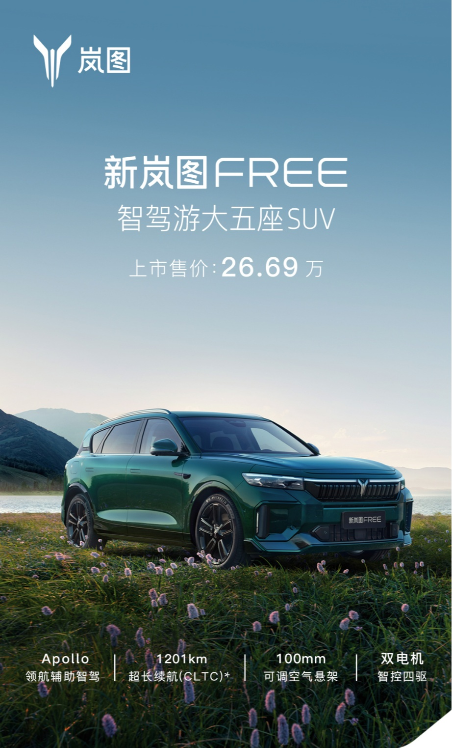 嵐圖汽車(chē)CEO盧放表示,作為“智駕游大五座SUV”,新嵐圖FREE的“智”,代表Apollo Highway Driving Pro領(lǐng)航輔助智駕帶來(lái)的智駕體驗(yàn);“駕”,意味著繼承了嵐圖品牌基因里的駕控實(shí)力;“游”,則是超長(zhǎng)續(xù)航、超低能耗以及豪華配置帶來(lái)的舒適享受。新嵐圖FREE有智慧、有力量、有激情,專(zhuān)為追求自由的“公路旅行家”打造,嵐圖期待與廣大用戶(hù)一起,盡情釋放心中的自由,奔赴遠(yuǎn)方,開(kāi)啟人生的“智駕游”。