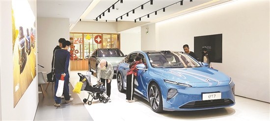 某蔚來(lái)空間體驗(yàn)店內(nèi),購(gòu)車(chē)者正在體驗(yàn)新車(chē)