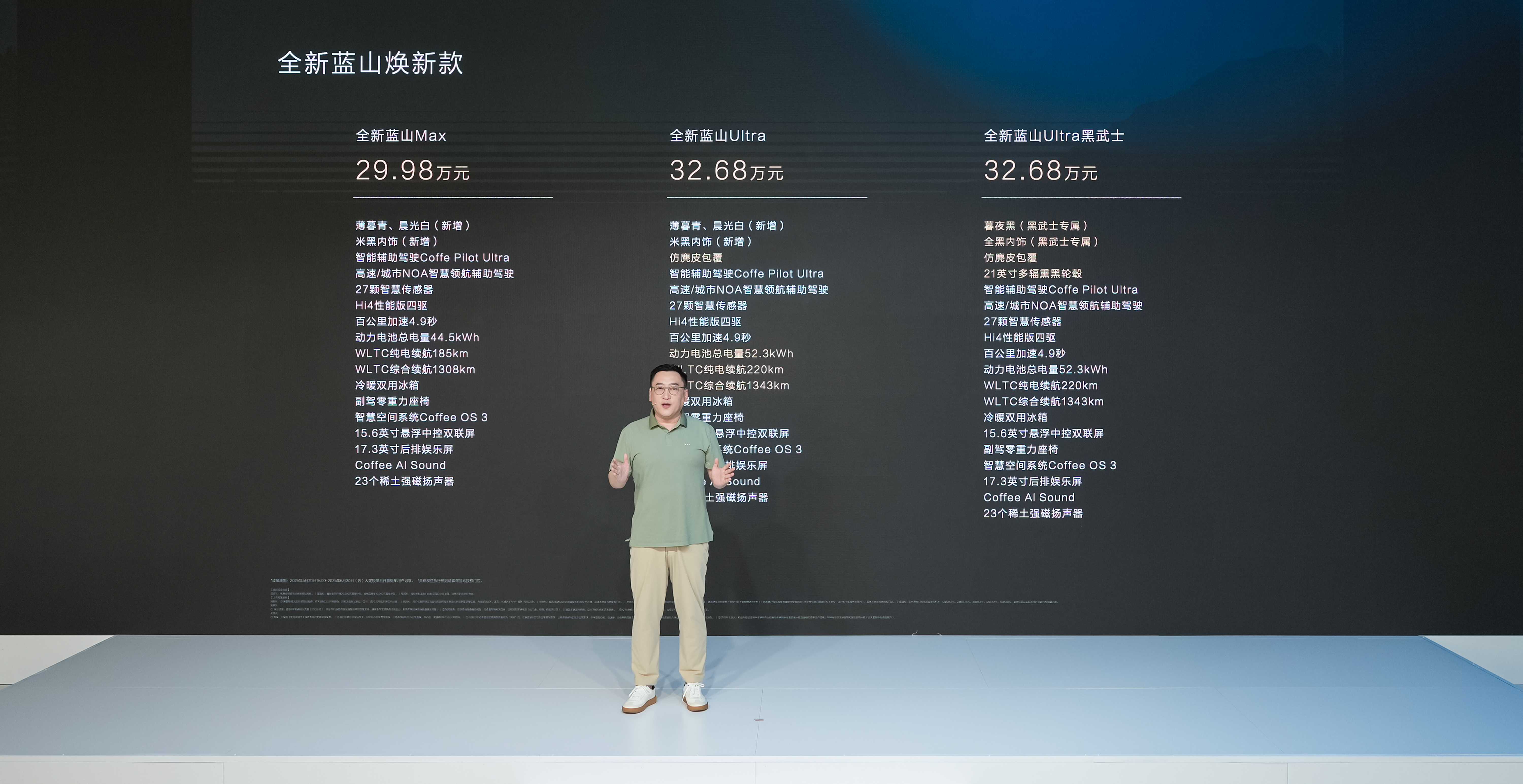 全新藍(lán)山煥新款正式發(fā)布,全新藍(lán)山煥新款MAX版、全新藍(lán)山煥新款Ultra版、全新藍(lán)山煥新款Ultra黑武士版售價(jià)分別為29.98萬(wàn)元、32.68萬(wàn)元、32.68萬(wàn)元。購(gòu)車(chē)用戶(hù)可享至高價(jià)值82,599元的限時(shí)煥新權(quán)益,魏牌老用戶(hù)置換全新藍(lán)山煥新款,可獲翻倍補(bǔ)貼及終身免費(fèi)流量。