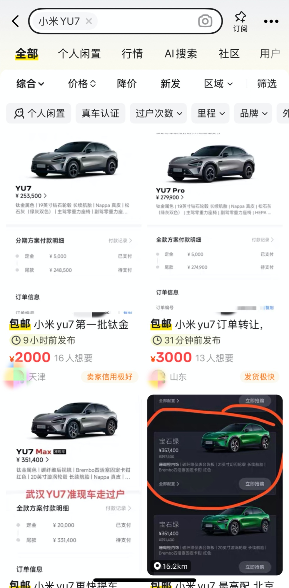 央廣網(wǎng)記者查閱某二手交易平臺發(fā)現(xiàn),自小米YU7上市后,該平臺已出現(xiàn)大量轉(zhuǎn)讓訂單信息,轉(zhuǎn)讓金額2000元-2萬元不等。