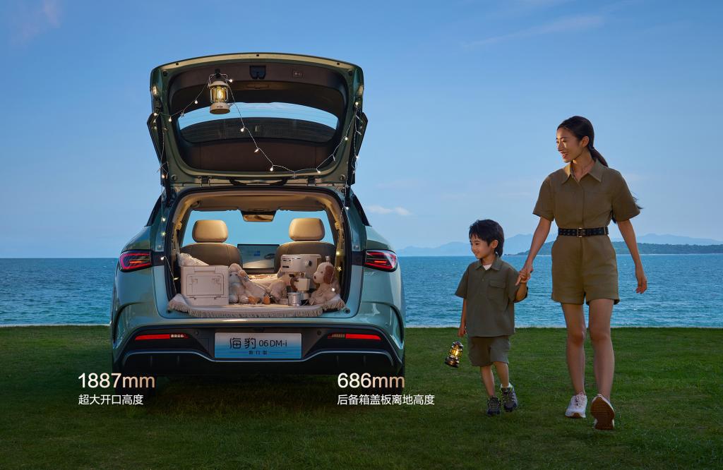 海豹06DM-i旅行版車身尺寸為4,850mm*1,890mm*1,505mm,軸距為2,790mm,后排座椅放倒后容積達(dá)到1535L,全系標(biāo)配電動(dòng)后尾門,后備箱開(kāi)口高度達(dá)1887mm,后備箱蓋版離地高度僅686mm,可取放大件物品。新車后備箱還配備同級(jí)最多9個(gè)實(shí)用掛鉤,配合全系標(biāo)配的車載行李架,空間功能性和拓展性進(jìn)一步提升,實(shí)現(xiàn)場(chǎng)景自由。