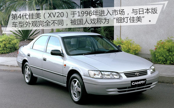 第4代佳美(XV20)于1996年進入市場,進入國內(nèi)的仍是佳美海外版車型,在設計上與日本本土版采用了完全不同的理念。讓整車看上去更加修長流暢,車頭和車尾都被設計得趨于扁平,由此帶來的是更細長的頭燈和尾燈,所以XV20在國內(nèi)被人們戲稱為“細燈佳美”。