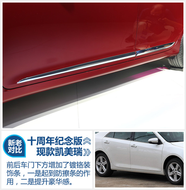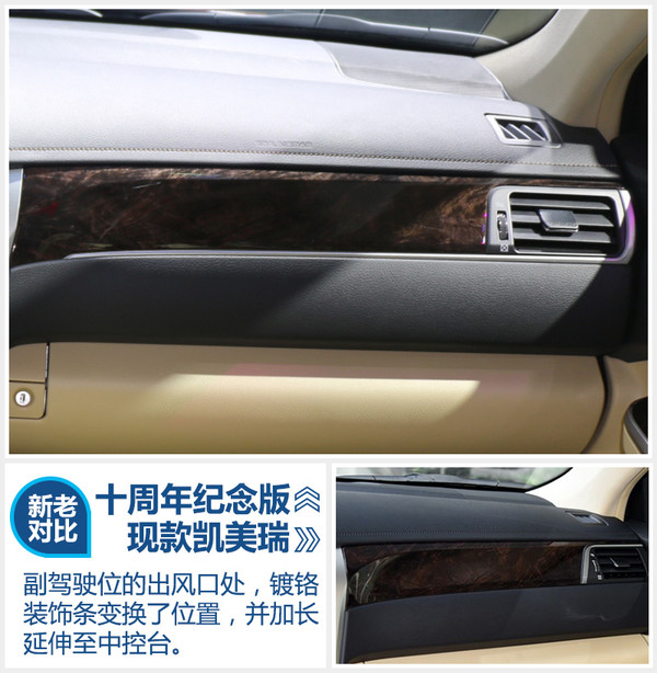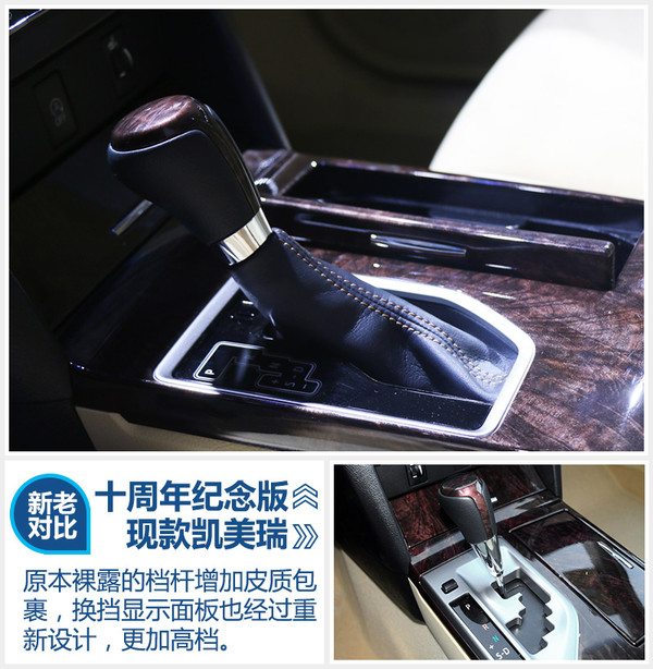 凱美瑞的“蛇形”換擋機制一直是筆者非常喜歡的設計,最起碼在開車的時候不會因為換錯擋而發(fā)生意外碰撞。但是說實話,裸露的檔桿總覺得缺了點什么。十周年紀念版將檔桿周圍加上了皮質(zhì)包裹,立馬將中控臺的“氣質(zhì)”提升了一個檔次,筆者本人是非常喜歡的。另外,副駕駛面前的木紋面板也增加了一條鍍鉻裝飾。