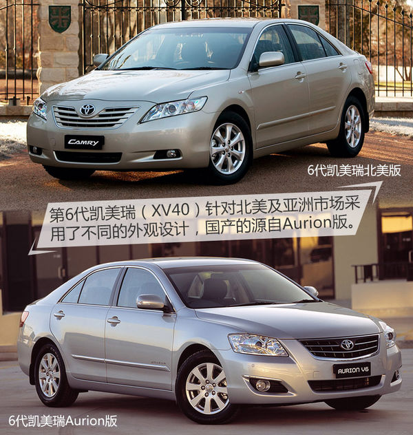 第6代凱美瑞(XV40)誕生于2006年,6月17日正式上市,由廣汽豐田進行本土化生產(chǎn)。雖然是豐田的全球化車型,但是XV40針對北美及亞洲市場采用了不同的外觀設計。北美版的車燈更加“鋒利”更加年輕運動,而國產(chǎn)的凱美瑞則采用了更加符合東方審美的亞洲版造型,又被稱作Prestige版或Aurion版。
