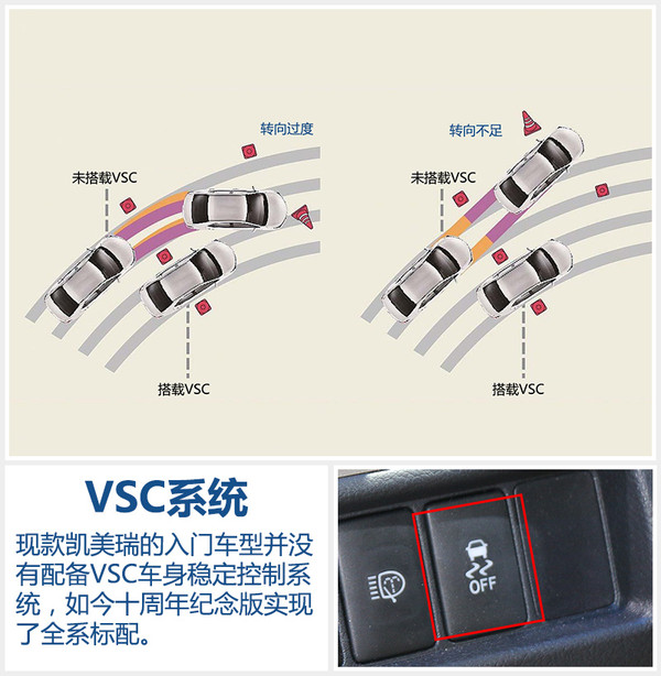 目前在售的現(xiàn)款凱美瑞入門版車型,并沒有配備VSC車型穩(wěn)定控制系統(tǒng),這對于預算有限的消費者來說,原本可以成為購買目標的凱美瑞,很有可能就因為這一個配置被篩掉了。如今,十周年紀念版實現(xiàn)了全系車型標配VSC系統(tǒng)。