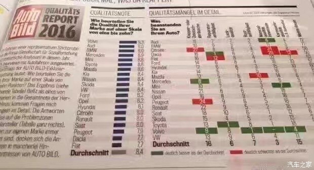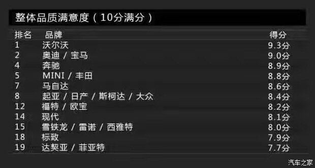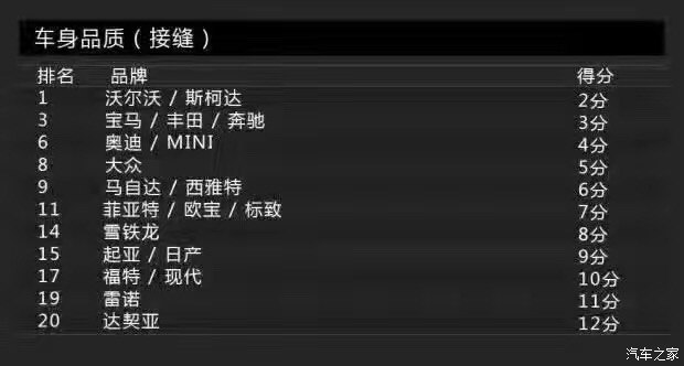 Bild調(diào)查的車身品質(zhì)(接縫)主要包括車身品質(zhì)、開關(guān)門的手感、鋼板接縫及經(jīng)常與身體接觸的地方。沒錯,這一單項(xiàng)表現(xiàn)最佳的是沃爾沃,得分為2分。這里小編要敲黑板提醒大家注意了:在車身品質(zhì)(接縫)滿意度上,得分最低表現(xiàn)最好。當(dāng)然,斯柯達(dá)也得到了2分,寶馬、奔馳則同為3分。而得分最高的就是前面提到的達(dá)契亞,它的得分是12分,換句話說就是達(dá)契亞是車身品質(zhì)滿意度最低的品牌。有意思的是與達(dá)契亞一起墊底是法系品牌雷諾,它的得分是11分。