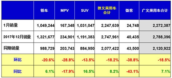 具體車型方面,1月SUV和轎車的銷量環(huán)比均出現(xiàn)下滑,同比則大幅增長(zhǎng),這也是1月份乘用車市場(chǎng)實(shí)現(xiàn)開門紅的主要?jiǎng)恿?;而MPV仍沒(méi)有復(fù)蘇的跡象,銷量同環(huán)比均出現(xiàn)下滑。