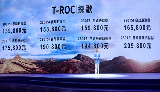 7月30日, 一汽-大眾首款SUV——T-ROC探歌在深圳上市。新車(chē)提供200TSI、230TSI和280TSI三款動(dòng)力選擇,并提供四驅(qū)版本,共8款車(chē)型,售價(jià)區(qū)間13.98-20.98萬(wàn)元。