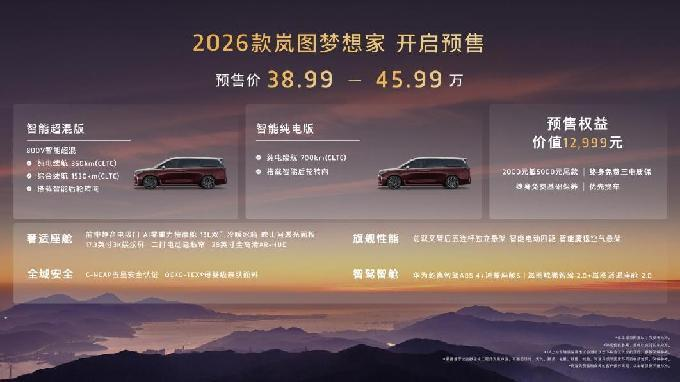 8月29日,第二十八屆成都國際汽車展覽會盛大開幕。全面煥新升級的“新時(shí)代旗艦MPV”2026款嵐圖夢想家預(yù)售亮相。本次新車共推出智能超混版和智能純電版兩個(gè)動力版本,預(yù)售價(jià)為38.99萬-45.99萬,同步推出了價(jià)值超萬元的多項(xiàng)重磅權(quán)益,包括2000元抵5000元尾款的膨脹金,終身免費(fèi)三電質(zhì)保、終身免費(fèi)基礎(chǔ)保養(yǎng)和優(yōu)先交付提車。9月1日起,2026款嵐圖夢想家展車、試駕車將陸續(xù)到店,消費(fèi)者可以進(jìn)店親自體驗(yàn)新車的獨(dú)特魅力。